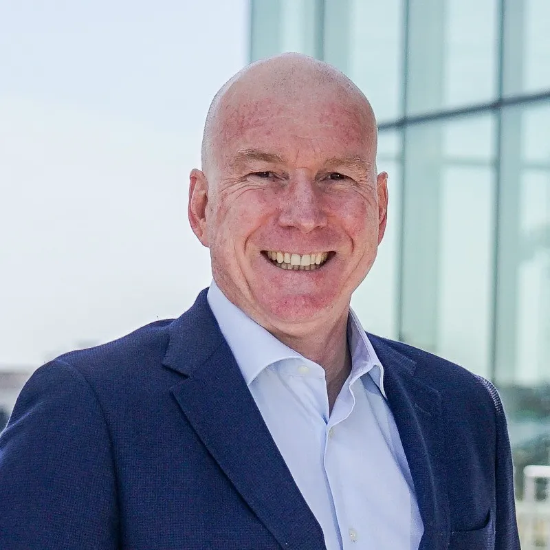 Professional headshot of a man in a blue suit and light blue shirt, smiling at the camera.