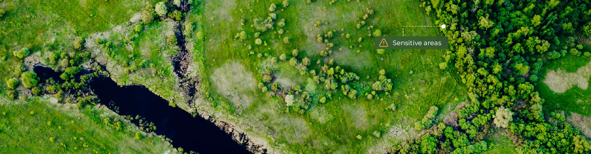 Aerial view of a mixed landscape showing grassland, wetlands, and forest edges with a highlighted “sensitive areas” indicator, illustrating biodiversity monitoring using geospatial analysis.